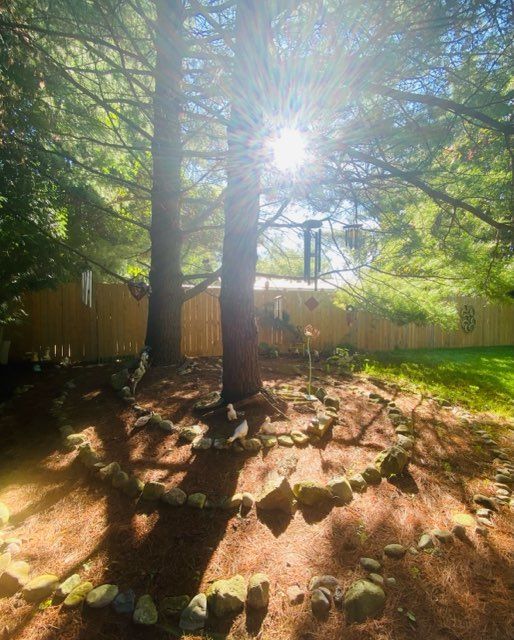 Her labyrinth PERFECTLY compliments the land in which it is now weathered and embedded. A stand of two mature pine trees with SWEEPING branches are the centerpiece. Their dropped needles had long prepared the ground for JUST such an artistic and spiritual expression. Seeing their PERFECTION in that space felt as if the trees themselves had conjured the labyrinth. Perhaps it was their DESTINY to frame the centrum, the core. If I wasn’t so self conscious I might have sat on the ground or sprawled out on my back on the pine needles to look up through the trees and watch the raindrops fall on my face.